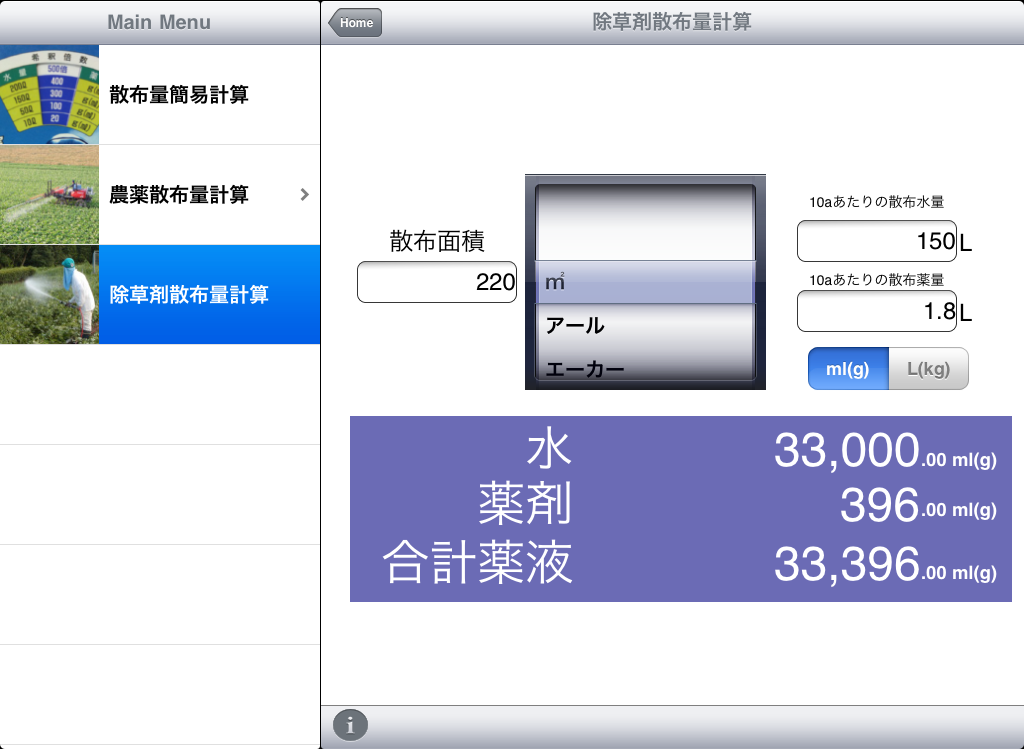 このアプリケーションでは散布面積と希釈倍率から水量、薬剤量を算出する際小数点以下2桁で丸めているため、計算結果には若干の誤差が含まれます。
